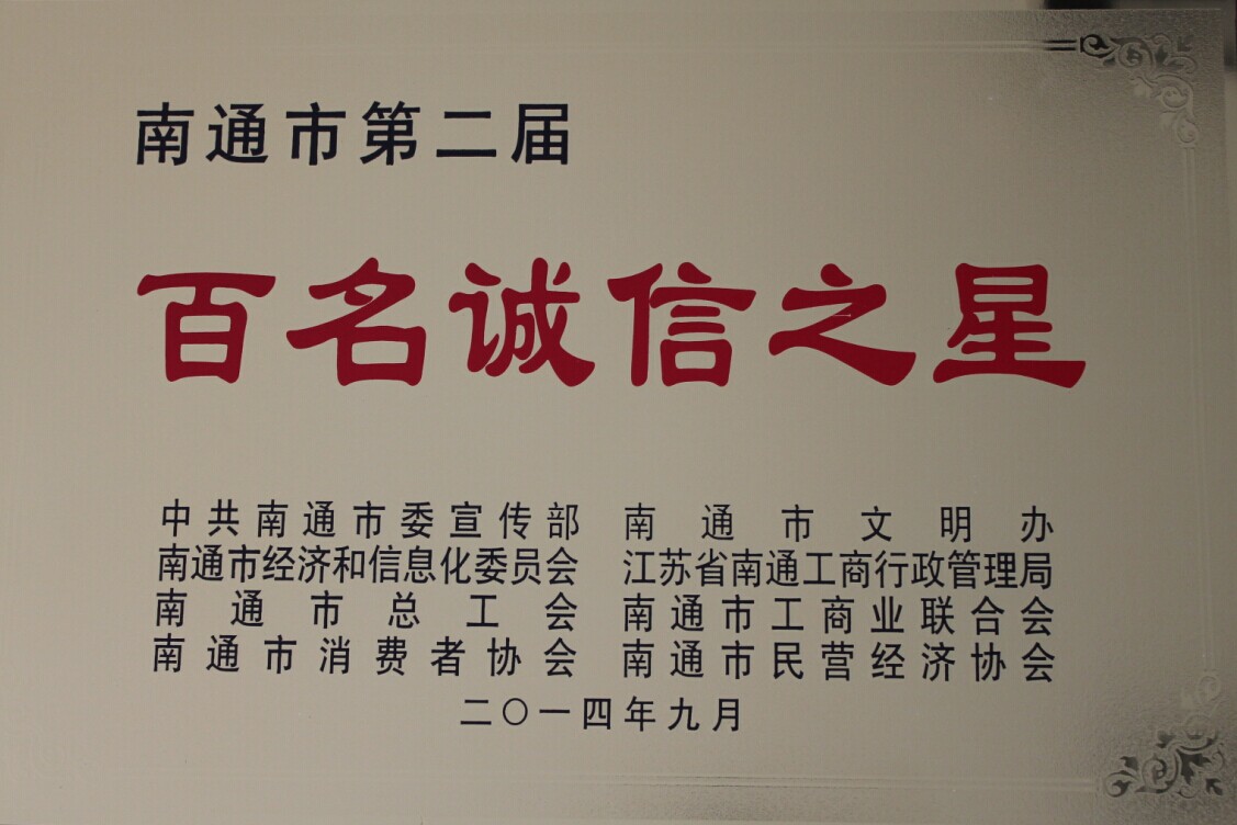由南通市工商局等八部門聯(lián)合舉辦的南通市第二屆“百名誠信之星”評選近日揭曉,公司董事長兼總經(jīng)理、黨支部書記周紅梅榜上有名。 對于周總的當(dāng)選,伙伴和朋友們一點也不感到意外。自2012年12月 ![]()