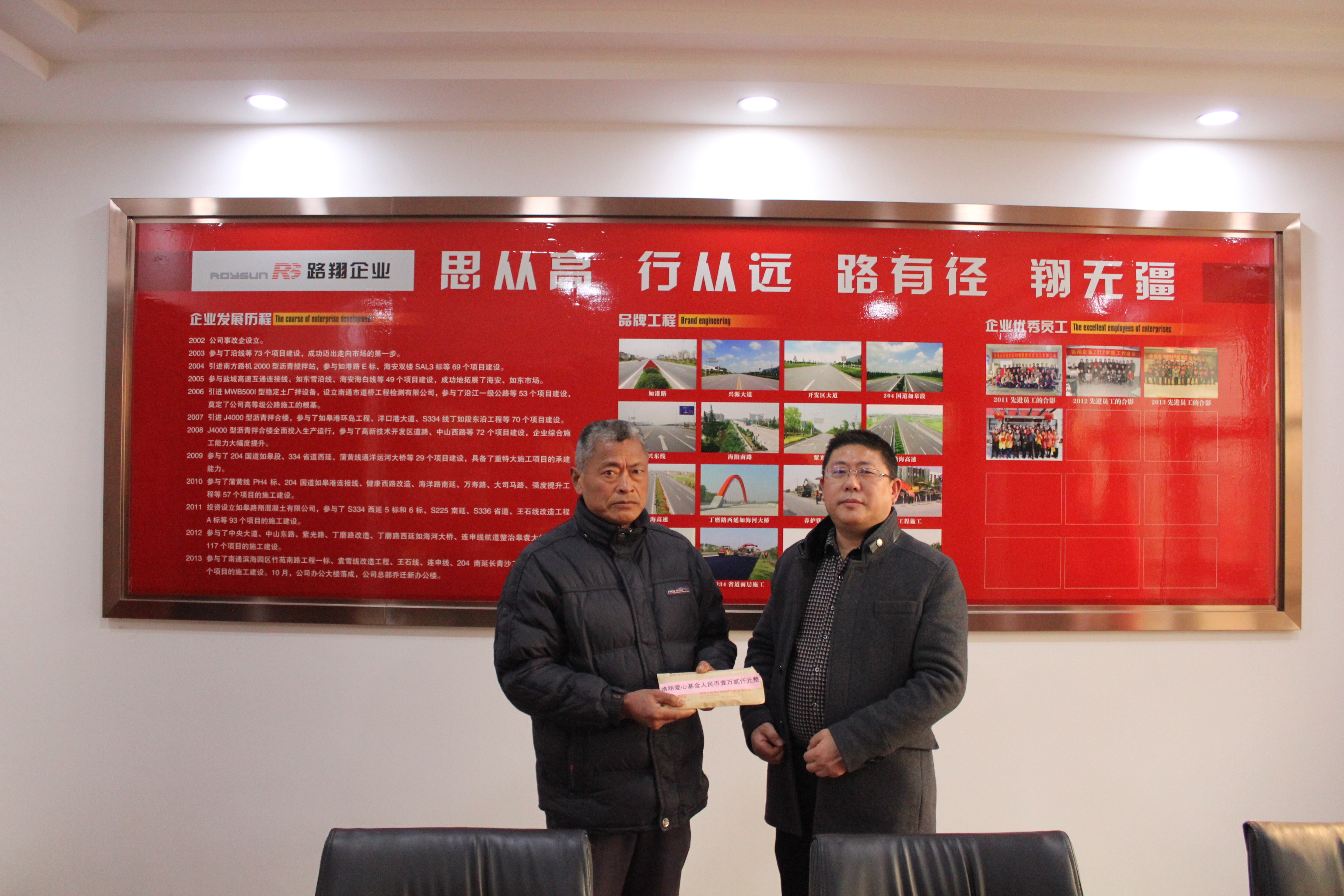 2014年12月,在市慈善基金會領導的關心和支持下,路翔企業(yè)發(fā)起成立了路翔愛心基金,專門用于本市地區(qū)性的扶貧助困、捐資助學、災害救助、社區(qū)建設、傳統(tǒng)文化教育及其他慈善資助活動!奥酚袕健蹮o疆、翔無涯”,我們堅信:有了路翔愛心基金這個回饋社會的平臺,路翔人一定會將愛的接力棒更好地傳承下去并發(fā)揚光大。[總經(jīng)辦 朱洪鋼] |