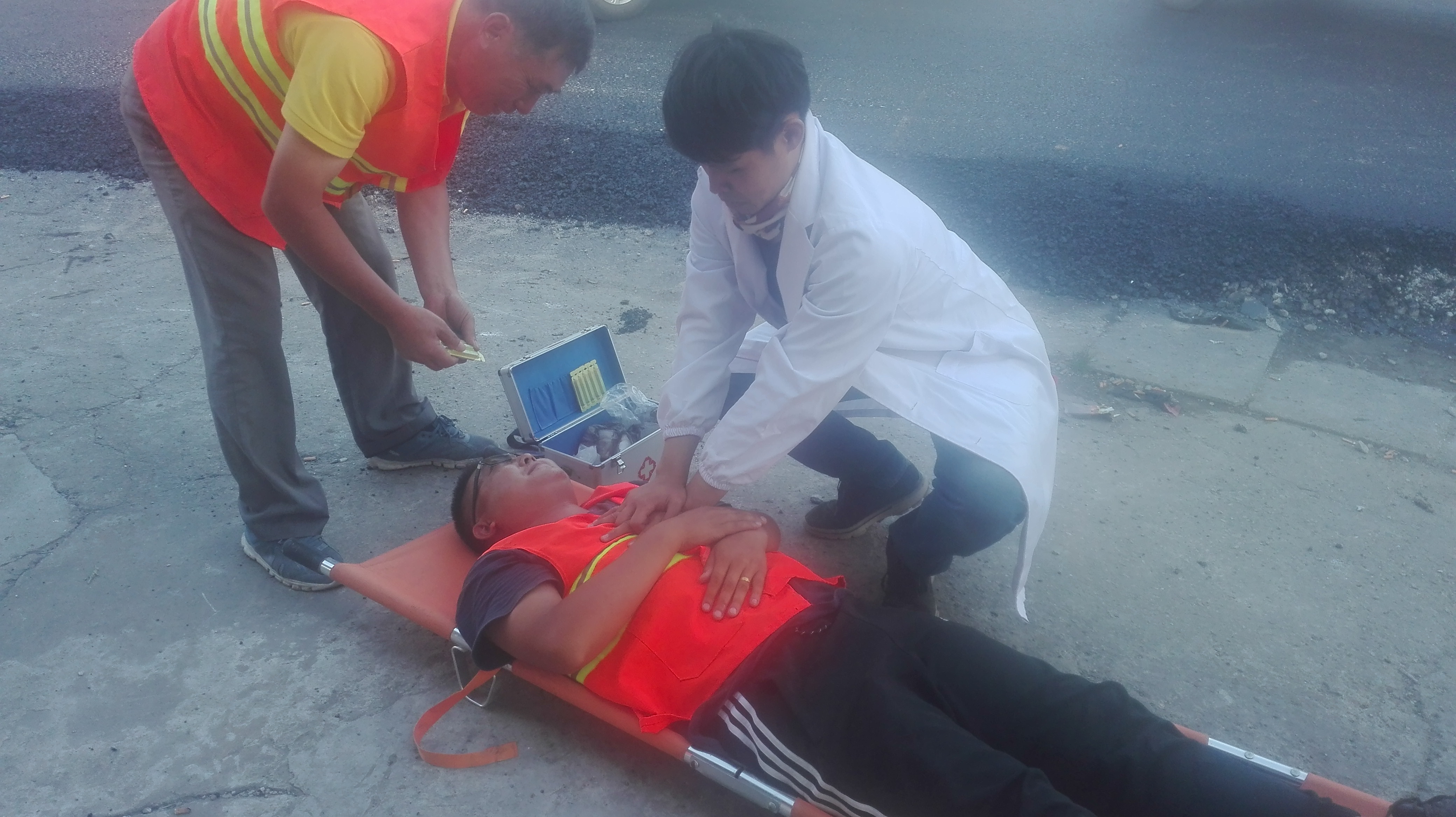 中午12時(shí)許,由公司負(fù)責(zé)人沙海江宣布演練目的、組織紀(jì)律和安全注意事項(xiàng),演練正式開始。施工現(xiàn)場(chǎng),一名瀝清攤鋪?zhàn)鳂I(yè)人員出現(xiàn)頭暈嘔吐現(xiàn)象,臉色發(fā)白,情況危急。正在現(xiàn)場(chǎng)巡查的安全員朱凱發(fā)現(xiàn)這一情況后,立即向10m外的施工隊(duì)長(zhǎng)薛鐵泉求救“隊(duì)長(zhǎng),出事了,一名工人頭暈嘔吐,臉色發(fā)白,有可能是中暑了,趕緊幫忙!